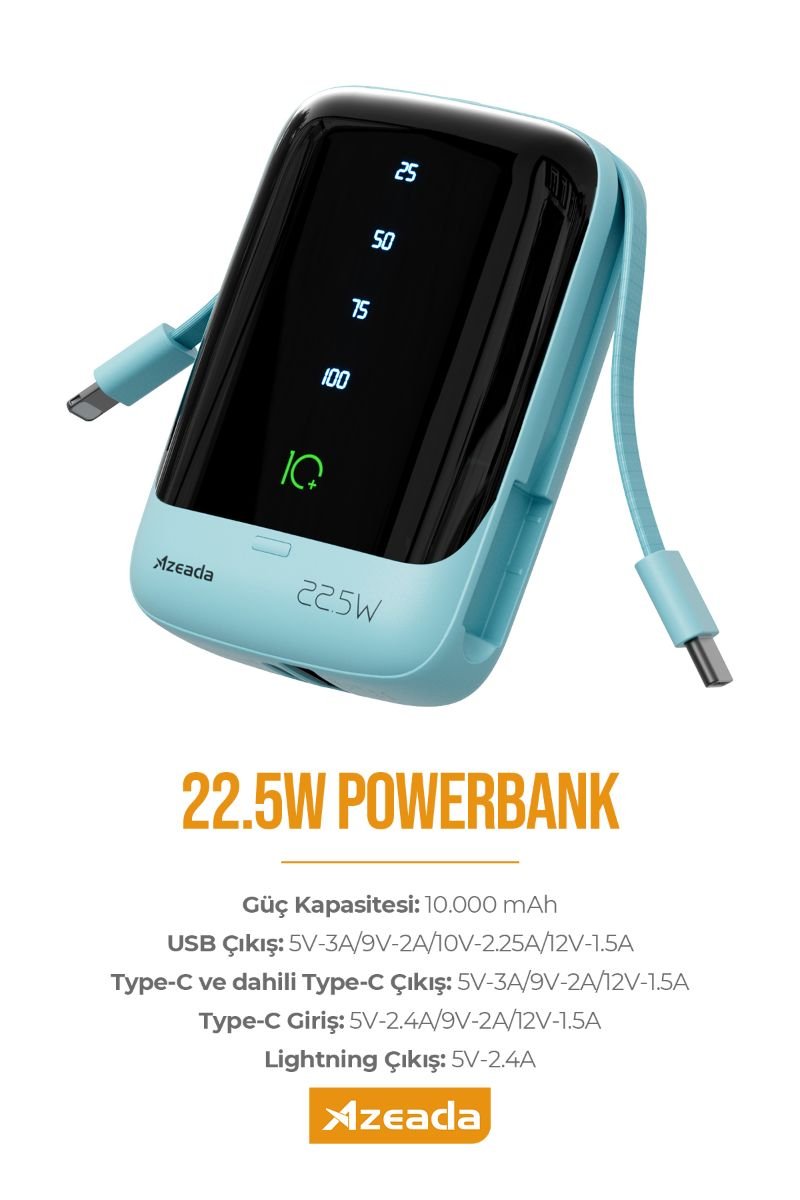 Azeada AZ-P01 22,5W 10000mAh Power Bank Dahili Kablolu
